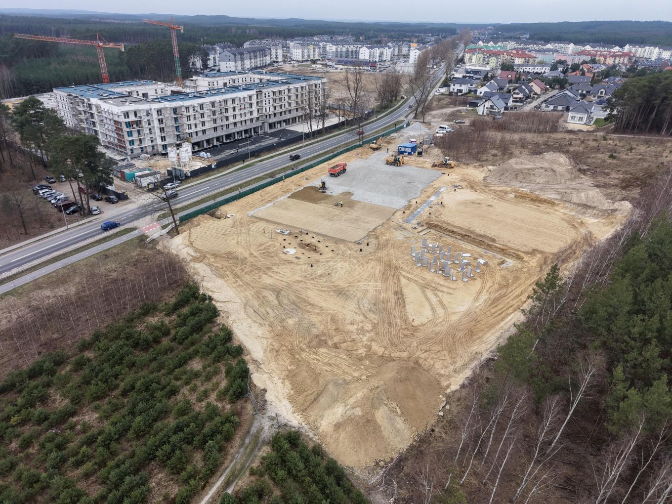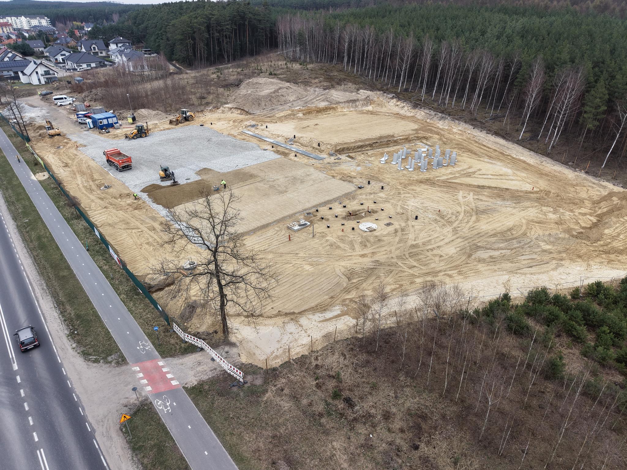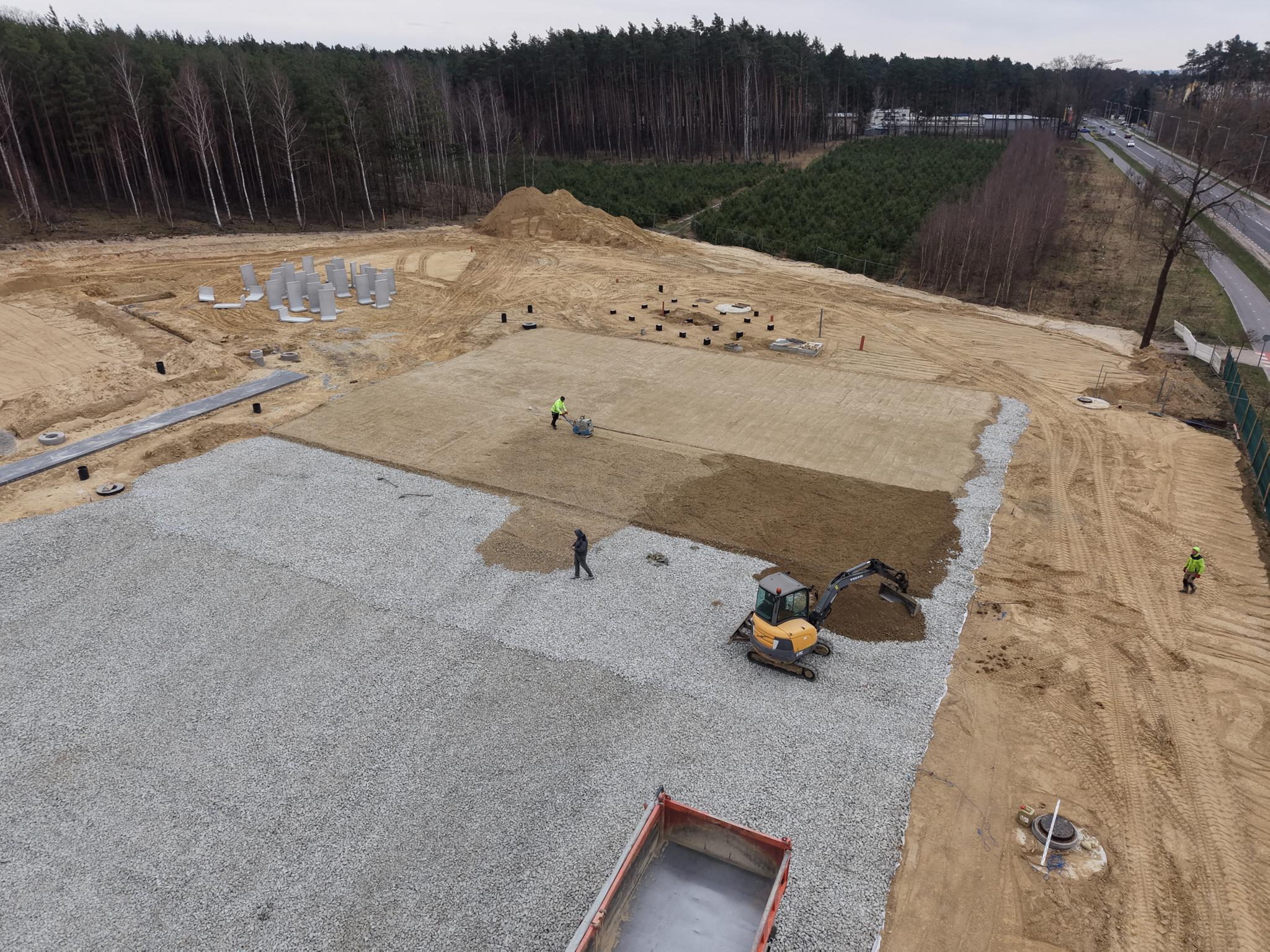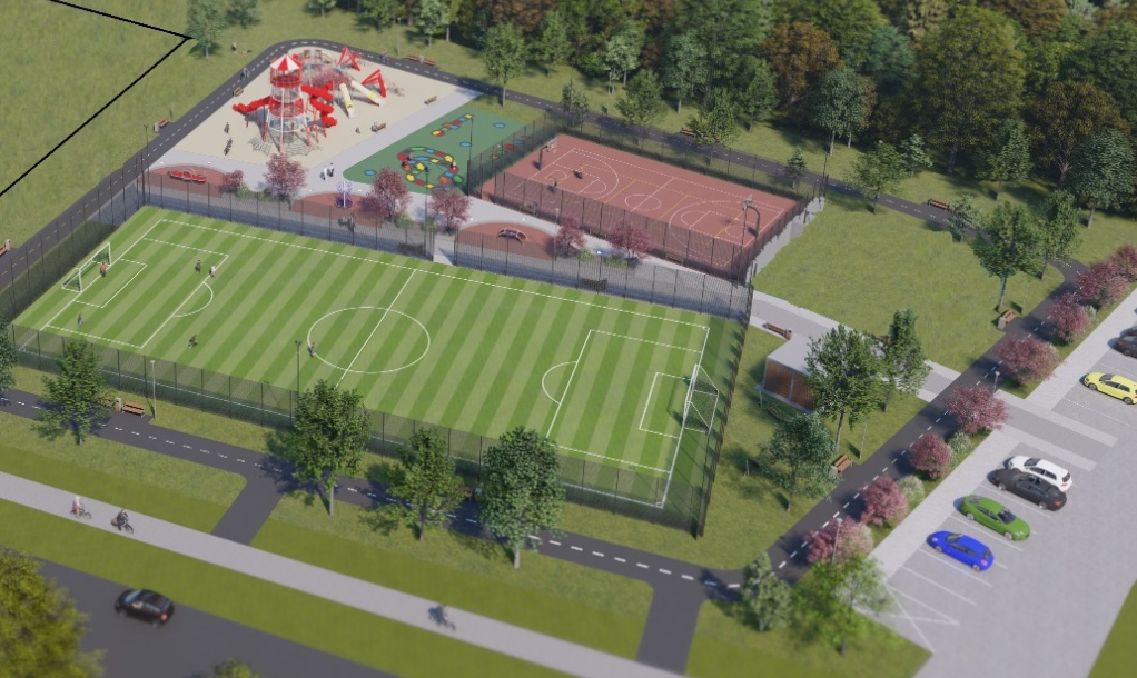 Dodatkowo inwestycja obejmuje wykonanie odwodnienia i nawodnienia terenu, nasadzenia zieleni oraz montaż elementów małej architektury.